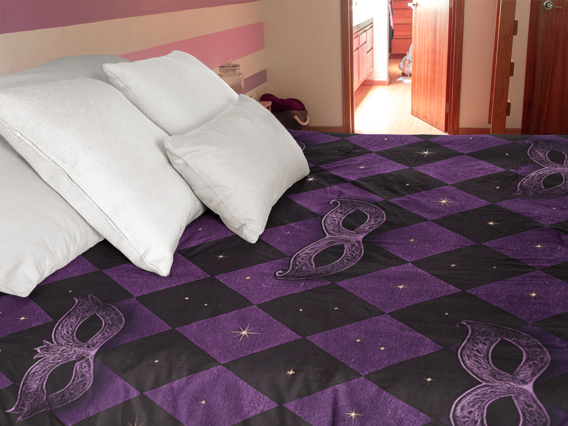 Step into the elegance of the carnival with the Jester’s Veil™ Duvet Cover. Featuring deep purple and black harlequin diamonds overlaid with subtle carnival masks and glowing silver stars, this duvet is a masterpiece of gothic glam. Perfect for witchy bedrooms, Halloween decor, or anyone who craves celestial drama with a regal edge.